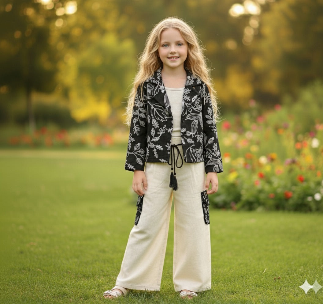Elevate your child's wardrobe with this adorable and comfortable kids’ outfit. This stylish set features a floral print jacket paired with soft linen pants, offering the perfect balance of fashion and comfort. Designed for toddlers, the outfit is versatile enough for both casual wear and special occasions. Available in a range of sizes, it’s the ideal choice for parents looking to combine ease of wear with chic design. Shop now for a trendy and breathable kids’ outfit that promises a stylish look and long-lasting comfort.